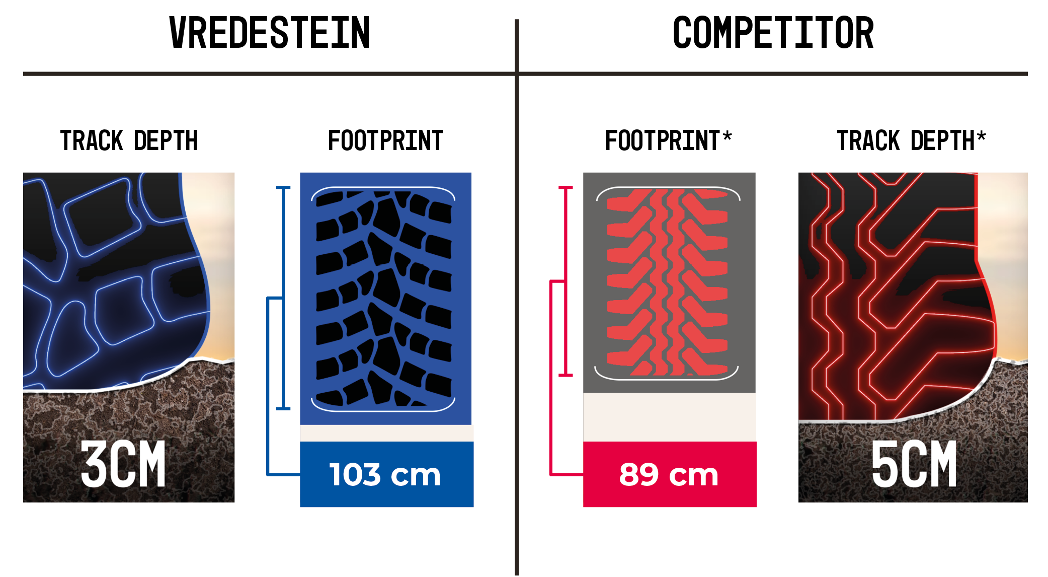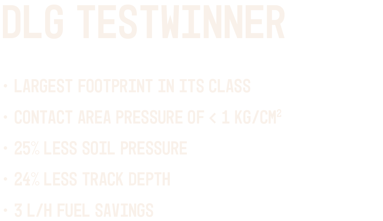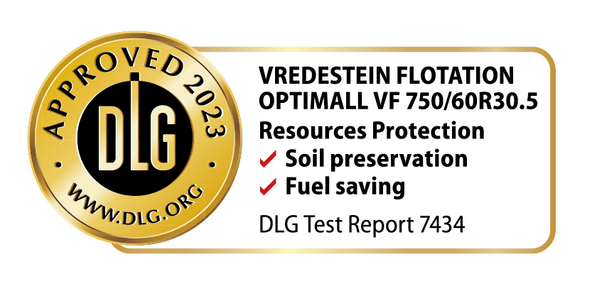 According to tests conducted by DLG in the field, compared to VF competitor tyre. Tyres tested VF 750/60 R 30.5 with 7.100 kg load and tyre pressure adjusted for max 10 km/h field work (1.0 bar).